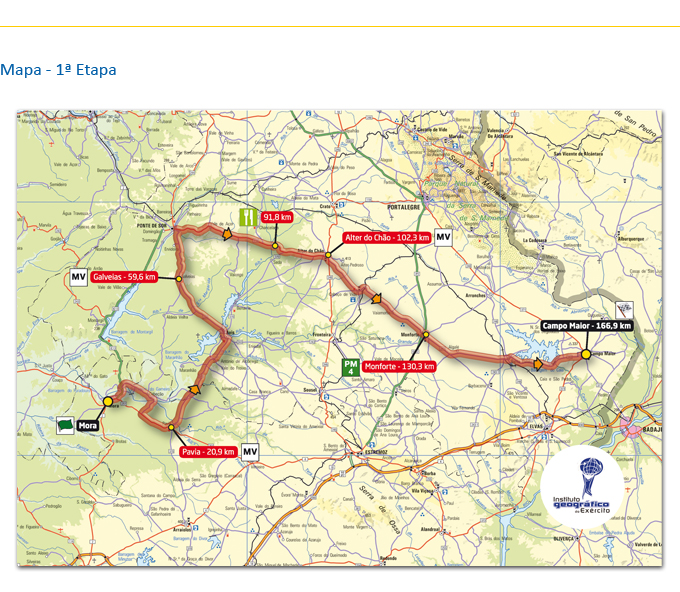 O pelotão de 17 equipas começa por se perfilar junto ao Parque de Feiras e Exposições de Mora onde na quinta-feira, dia 9, irá partir em direcção a Campo Maior. Esta primeira etapa, a mais curta, tem quase 167 quilómetros passando por Pavia, Galveias e Alter do Chão onde há metas volantes e Monforte onde foi colocada uma contagem para o prémio da montanha. A chegada em Campo Maior vai acontecer junto ao Estádio Capitão César Correia.